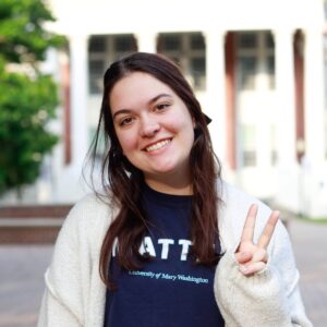 Meet Jordan Beaupre! Hailing from Leesburg, VA, Jordan joins us from the CDS department, which is no surprise. She’s captivated by the strong community ties at UMW and the meaningful connections students can forge with professors and mentors. Jordan’s also a devoted art enthusiast and a budding vinyl collector. Her beloved childhood movie is “The Princess Bride,” and her top binge-watch choice is “Psych” (2006). Jordan finds the beauty in videography and photography, which immortalize moments in time and serve as time capsules.